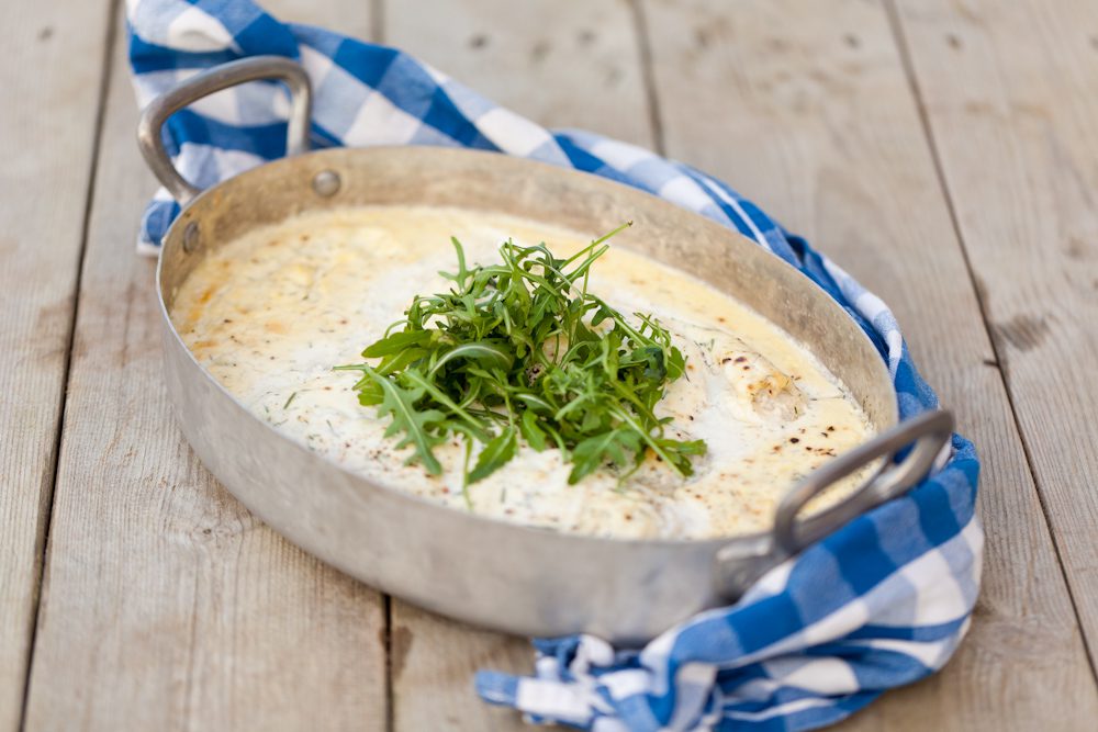 Lägg torskblocken i botten på en ugnsfast form. Blanda samman creme fraiche, dill, kaviar, citronpeppar och salt. Häll detta över fisken. Ställ in i ugnen på 220 °C i cirka 25 minuter eller tills fisken är genomkokt.