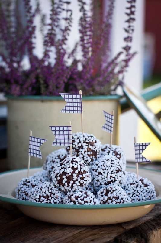 Först hade jag tänkt att rulla bollarna i fint strössel, men sedan ändrade jag mig. Det är ju ändå allra godast med helt vanligt pärlsocker eller kokos. Istället gjorde jag små flaggor av fin tejp och ett par tandpetare, riktigt kalasfint blev det! I somras gjorde jag liknande flaggor i vitt och grönt. Dom satte jag i en gigantisk skål med ljuvliga jordgubbar som jag serverade på mitt födelsedagskalas. Hur snyggt som helst!