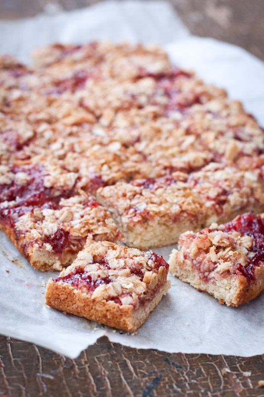 Smält smöret och blanda i havregryn, socker och vaniljsocker. Rör om väl och strö detta sedan över sylten. Grädda i nedre delen av ugnen i cirka 20 minuter i 225 °C. Låt kakan svalna innan du skär den i fyrkanter.