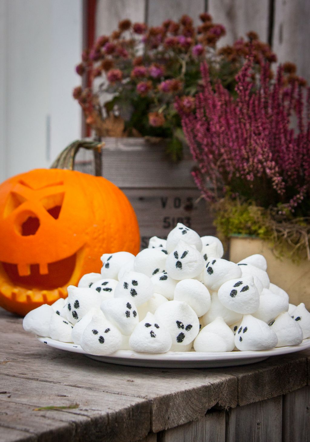 Allt du egentligen behöver är en påse färdiga maränger och en penna med ätbar färg. Förra året målade jag två stooora påsar maränger till halloweenfesten vi brukar ha för barnen där vi bor. Det tog sin lilla tid men barnen tyckte spökena var lite roliga 🙂