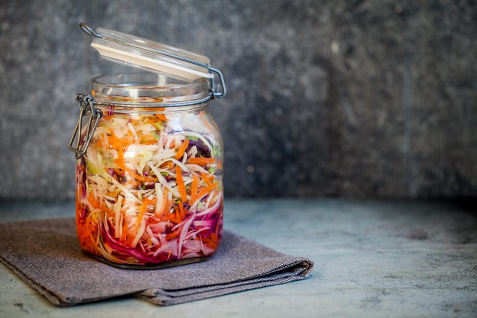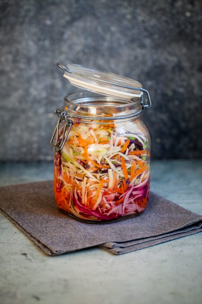 Jag hade rödkål i min och det gav allt en härlig lila ton efter ett par dagar.  Nu är det här ju ingen exakt vetenskap, så ta i av det du gillar bäst. Gör hälften så mycket eller dubbel sats. Här är liksom allt tillåtet 🙂