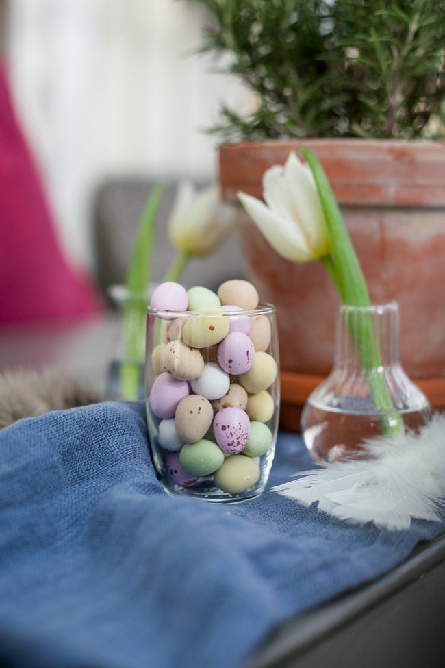 - Fyll små glas med fint påskgodis och placera ut runt om på bordet. Det blir en fin liten färgklick.