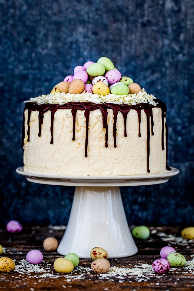 Fryst cheesecake, enkel att förbereda i förväg och blir riktigt snygg med den smälta chokladen som droppat ner längst kanterna. Dekorera med hyvlad vit choklad och fina ägg för extra påskin känsla!