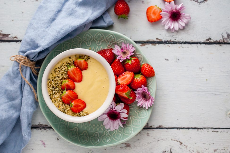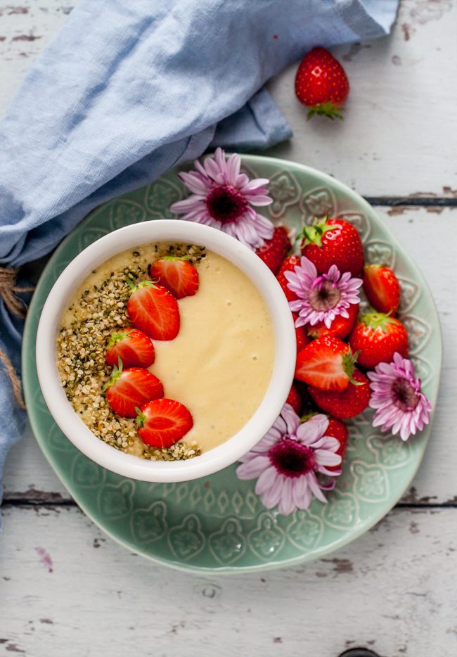 Jag har toppat min mangosmoothie med färska jordgubbar och hampafrö. Hampafrö är ett superfood och ett av de mest näringsrika fröerna vi har. Det innehåller bra med protein, fiber, Omega-3 och Omega-6. Perfekt att strö över salladen, ha på yoghurten eller som här, toppa din mangosmoothie med!
