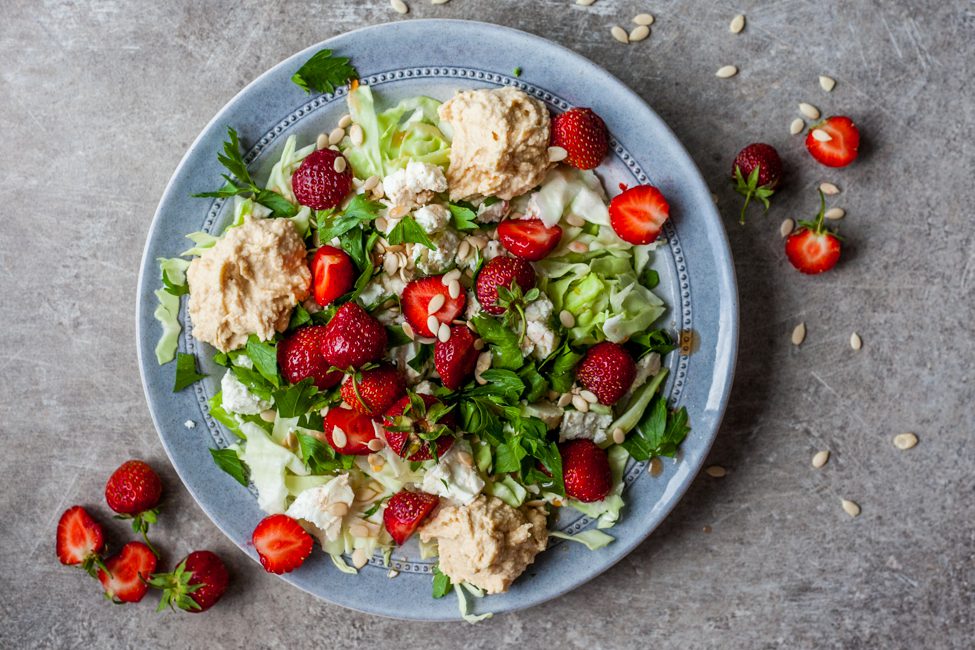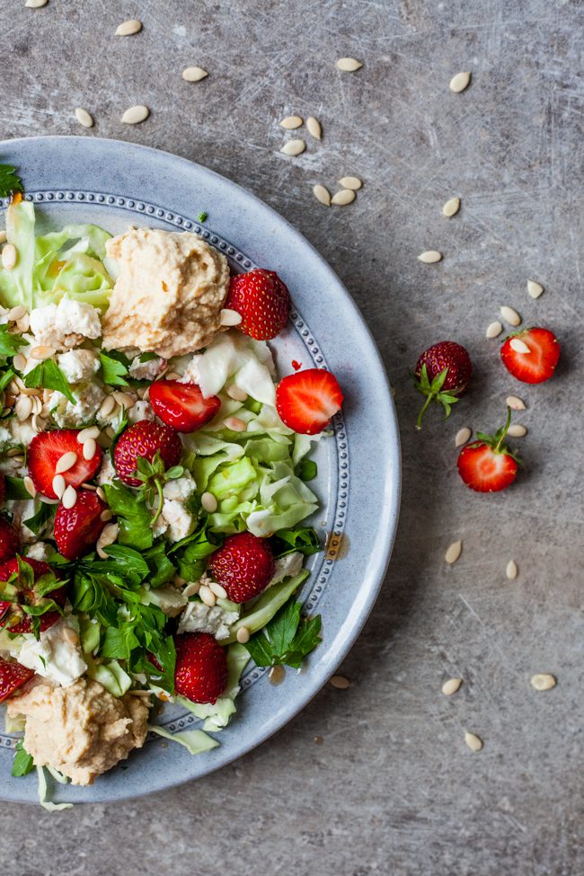 En sommarsallad som består av vad som finns i kyl och skafferi, det skulle jag kunna leva på hela sommaren. En sommarsallad med färsk vitkål, bladpersilja, rejäla klickar hummus, färska jordgubbar och lite frön. Mer än så behöver det faktiskt inte vara.