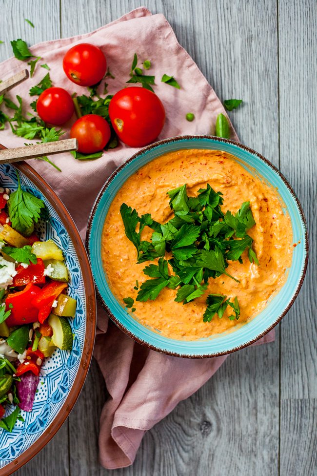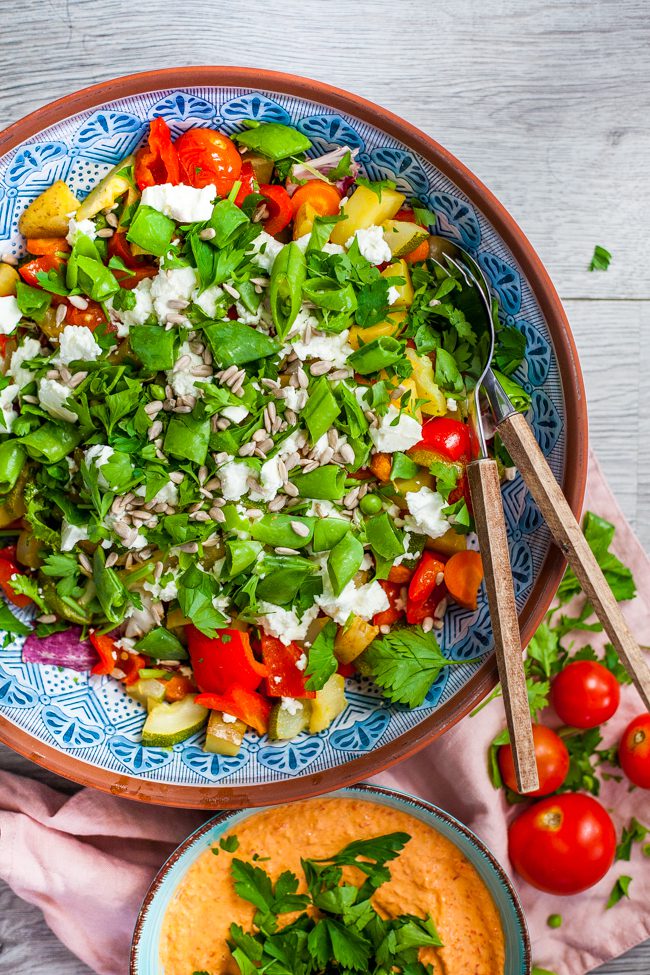 Skördesallad på ugnsrostade grönsaker och ajvardipp: