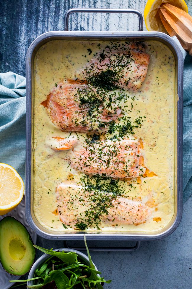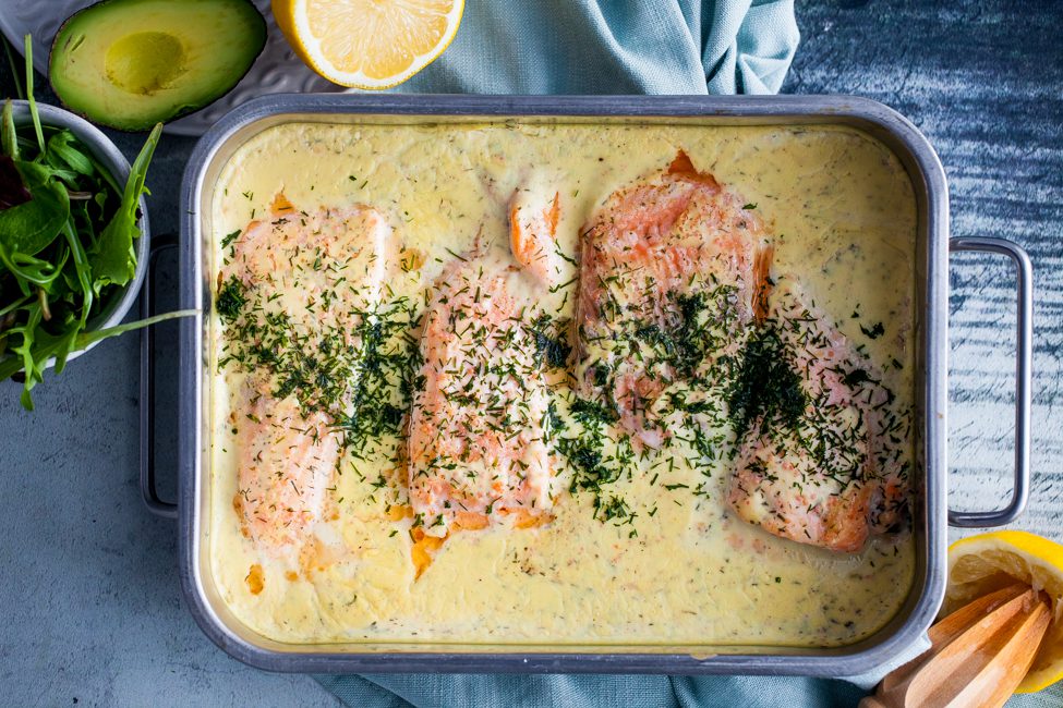 Blanda creme fraiche, mjölk och hummerfond i en kastrull. Låt allt koka upp och koka i cirka 5 minuter. Tillsätt sedan dill, rom och citron. Smaka av med salt och peppar. Häll såsen över fisken och ställ in i en 150 °C varm ugn. Ugnsbaka laxen i cirka 30 minuter eller tills laxen är klar.