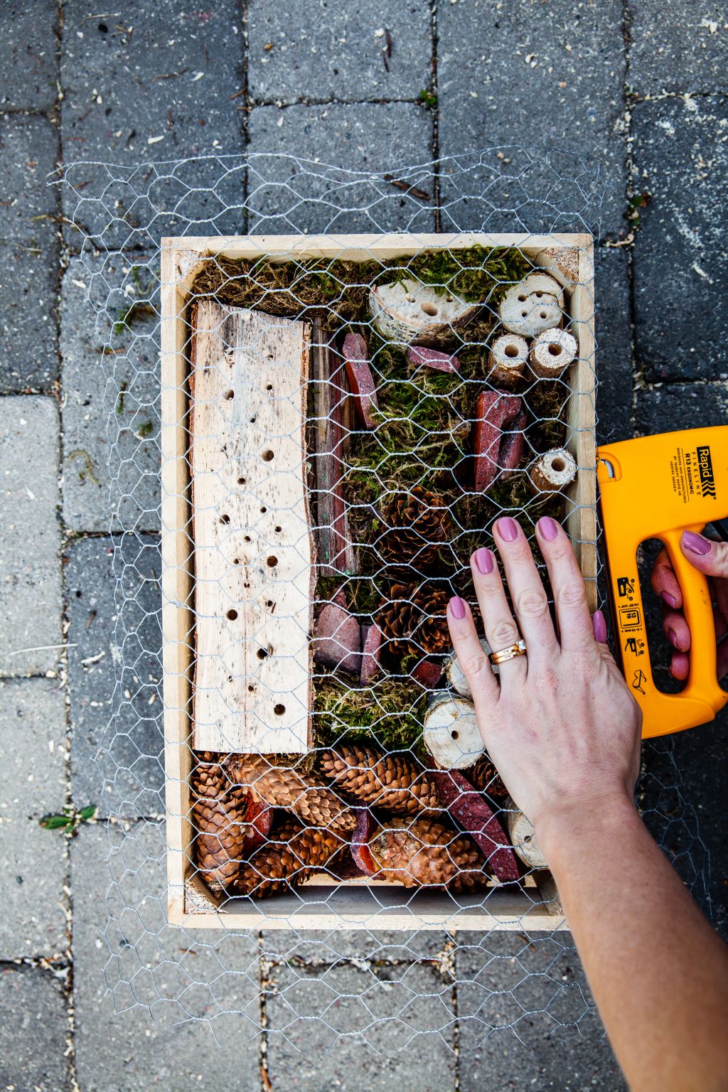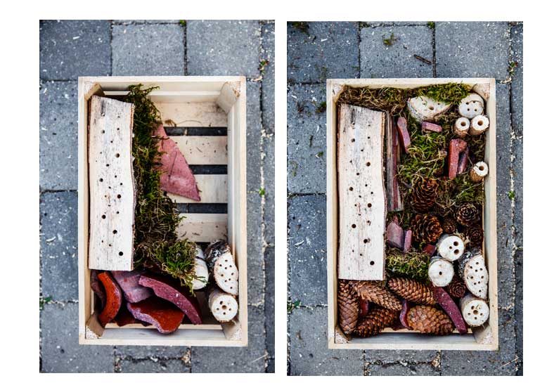 Sedan fyllde jag på med kottar, pinnar, vedträn och mossa. Plocka om tills du känner dig helt nöjd och se till att packa allt ordentligt.