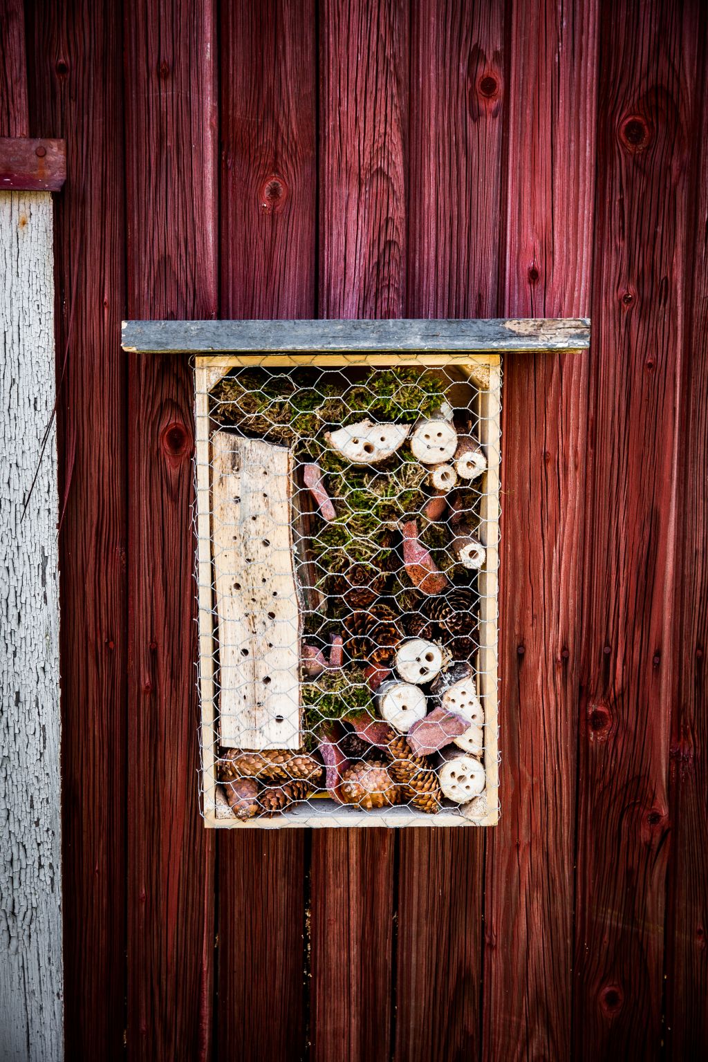 För att inredningen i ditt bihotell inte ska ramla ur eller för att småfåglar inte ska komma och störa bina fäste jag hönsnät runt om hela trälådan. All överflödig hönsnät klippte jag bort med en avbitartång.