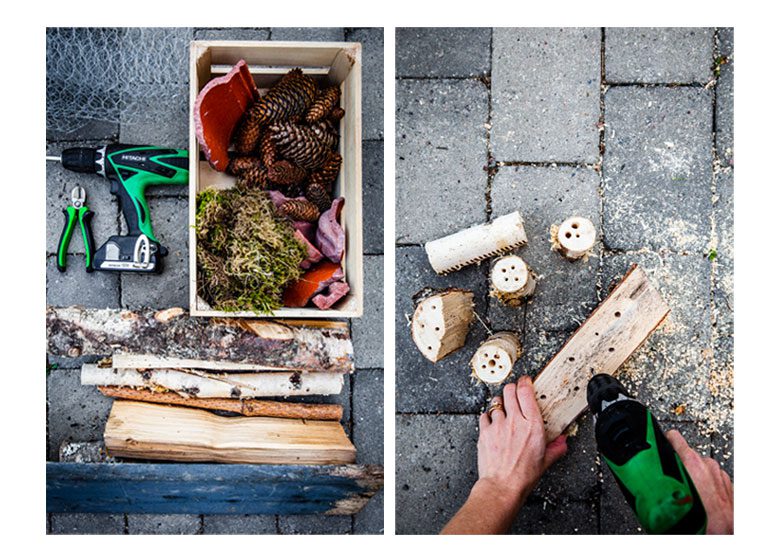 Börja med att borra 6-10 cm långa hål i pinnar och vedbitar. Hålen ska inte gå hela vägen igenom. Gör gärna olika stora hål. Allt mellan 3 och 10 mm är perfekt.