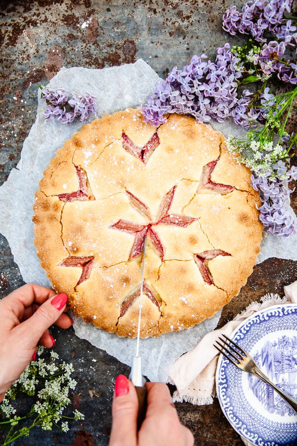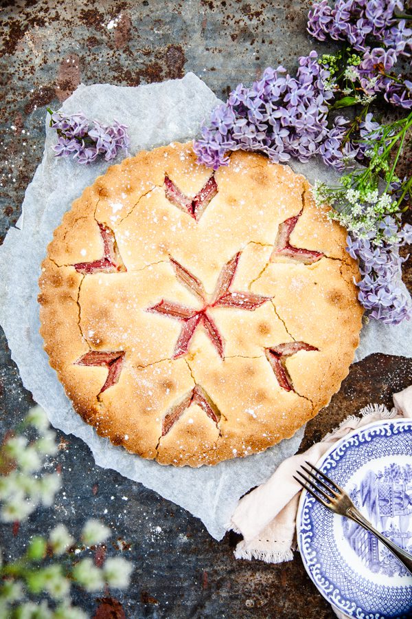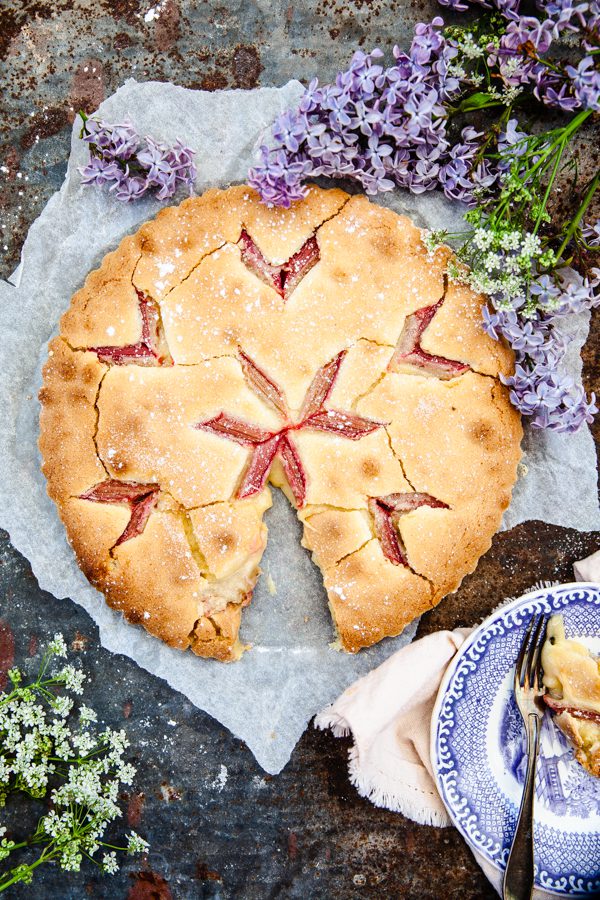 Skär rabarbern i fina bitar och placera ut på kakan. Strö över lite socker. Grädda i 180°C i cirka 25 minuter.