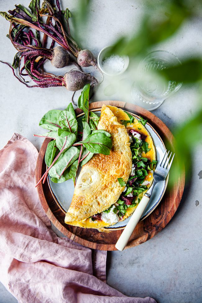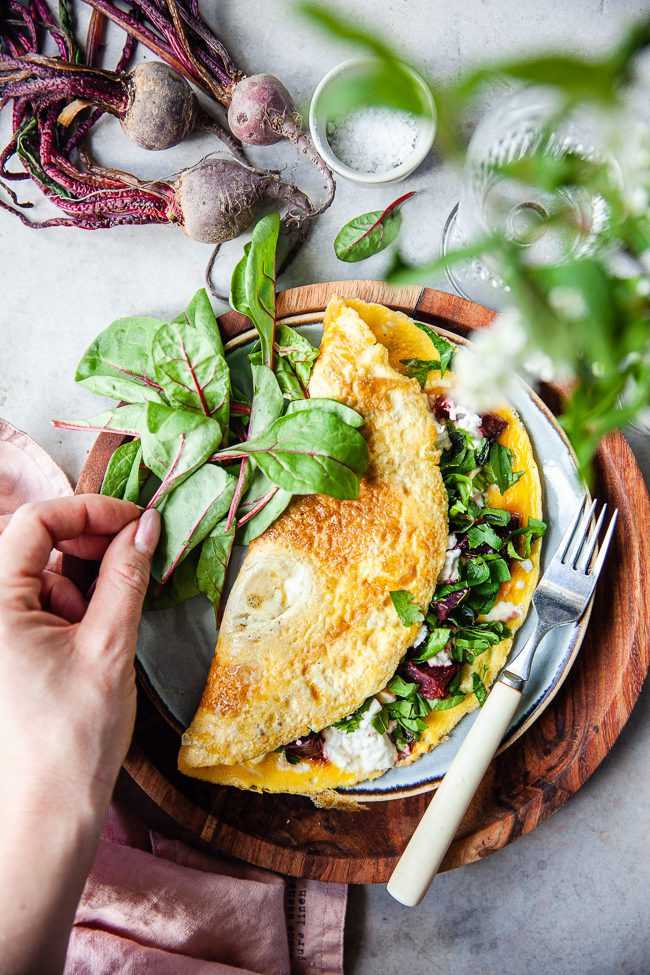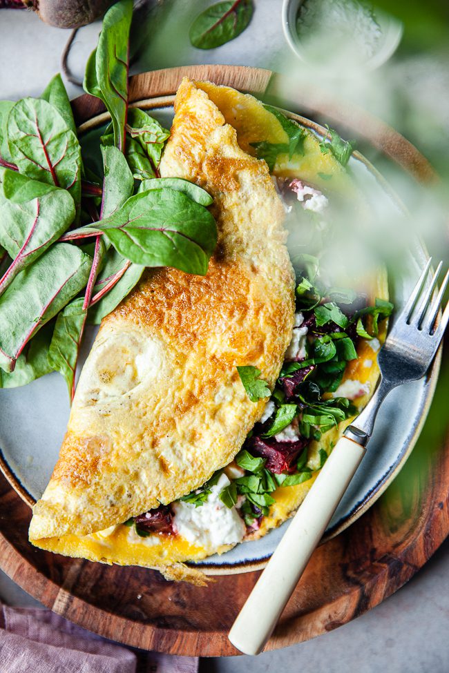 Vispa samman ägg, vatten och salt i en bunke. Hetta upp en stekpanna med olja i. Häll i äggsmeten och sänk värmen till medel. Dela rödbetorna och smula sönder fetaosten. Strö detta över halva omeletten. Låt den steka tills allt ägg stannat och blivit stekt. Strö över färsk persilja.