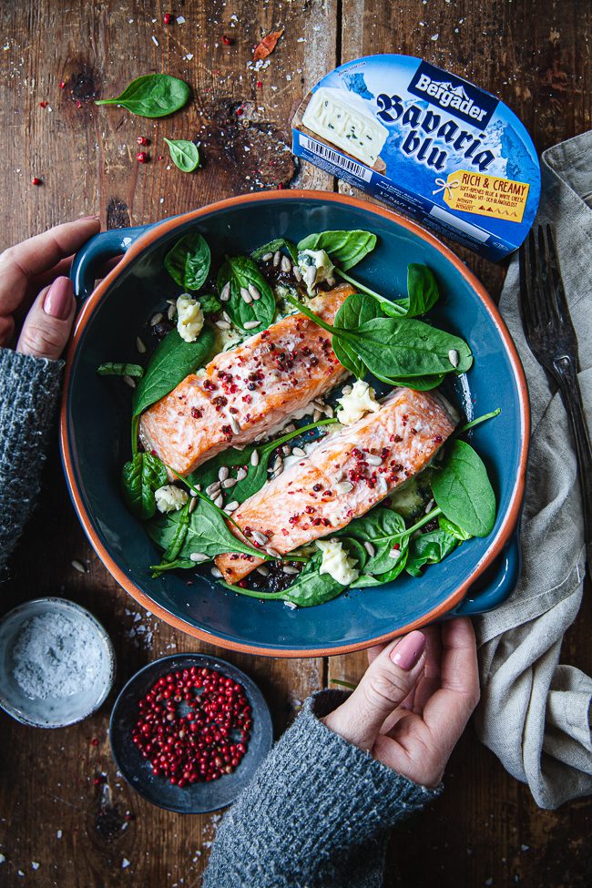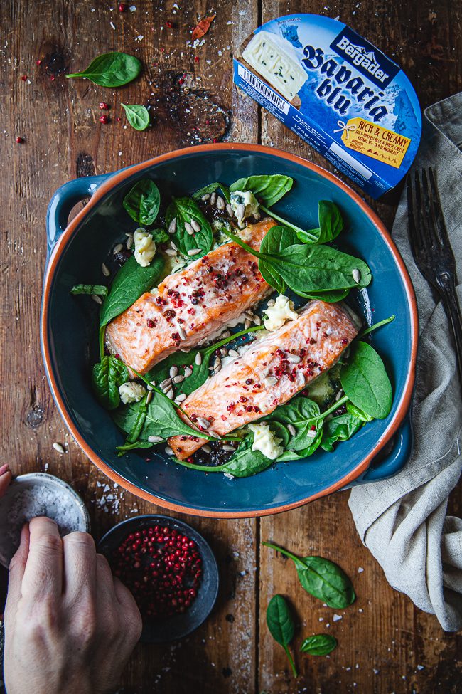 Strö ut resterande mängd bladspenat runt om den ugnsbakade laxen. Strö över solroskärnor, salt, rosépeppar och lite bitar av Bavaria Rich and Creamy (eller klicka ut lite av fyllningen över spenaten om du fick över).