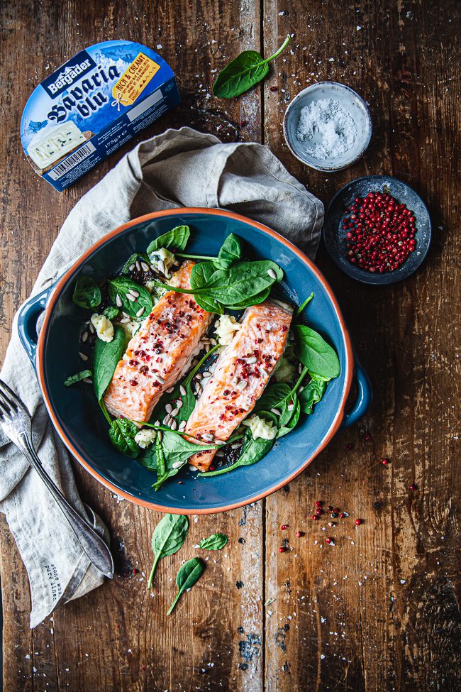I det här receptet har jag parat ihop några kompisar som verkligen gillar varandra. Stekt lök, stekt bladspenat, krämig blåmögelost, salt och så rosépeppar. Just rosépeppar tycker jag passar ofantligt bra till en krämig blåmögelost! Vackert är det också.