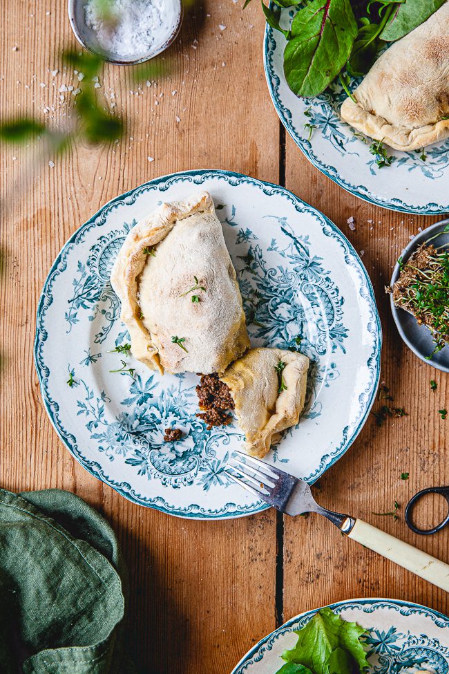 Kavla ut varje degboll till en rundel och fördela köttfärsen (ca 2 msk på varje). Strö över lite riven ost. Pensla kanterna med uppvispat ägg. Vik över degen och nyp eller tryck ihop kanterna. Låt vila på en plåt i cirka 20 minuter.