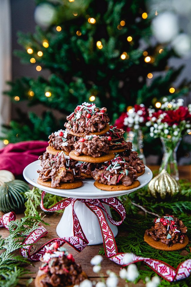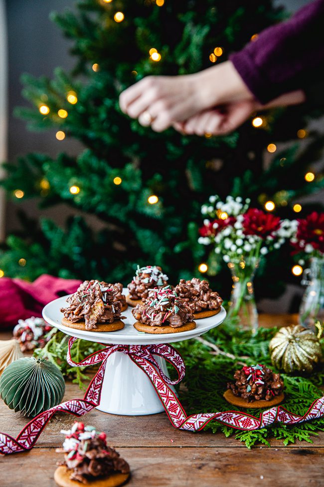 Ni vet den där klassiska cornflakeschokladen eller rischokladen man gjort sedan barnsben? Den där man smälter choklad och har i cornflakes eller puffat ris och så är godiset klart? Här har jag gjort en annan variant av den. Där cornflakes och puffat ris vänds ner i choklad med smak av pepparkaka och sedan klickas ut på runda, fina pepparkakor. Ett perfekt pyssel att göra tillsammans med barnen så här i juletid.