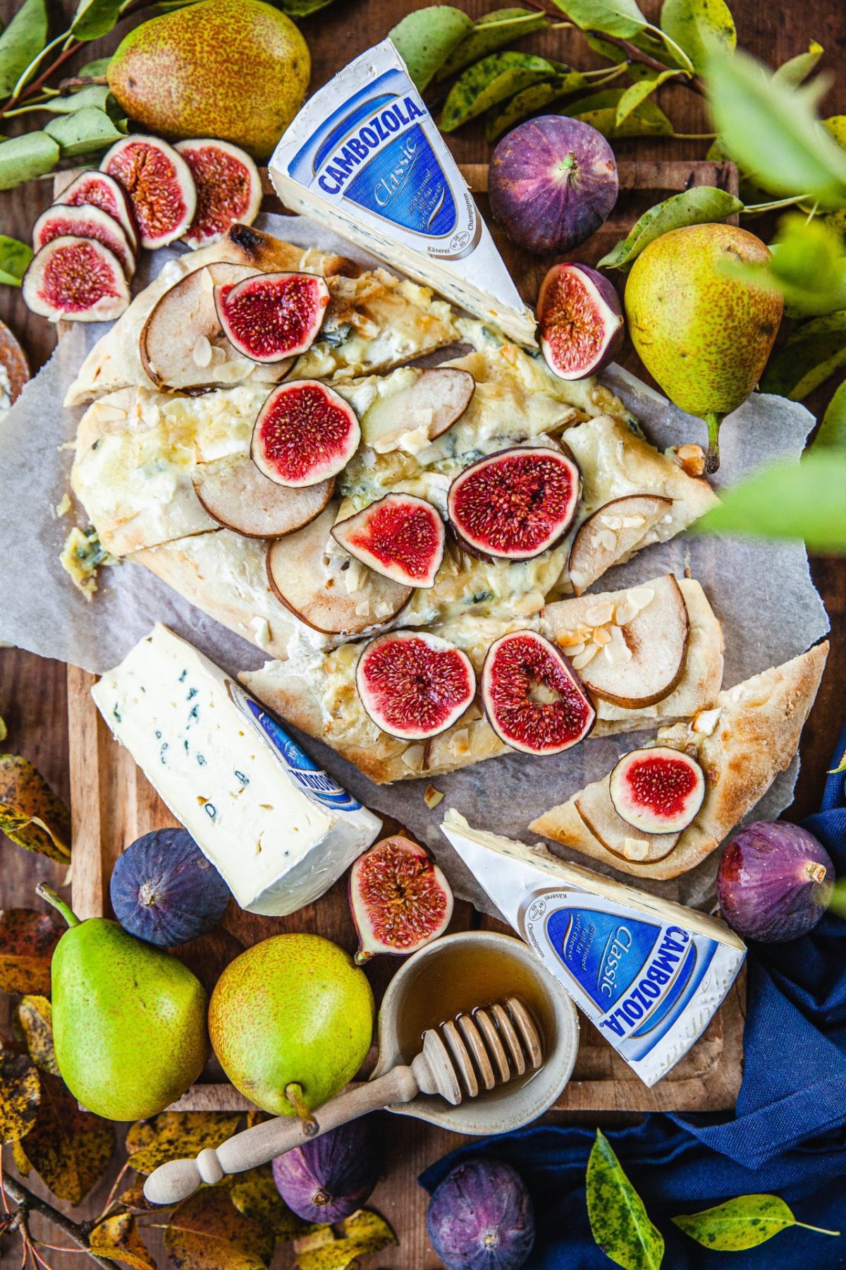 I höstas gjorde jag ett samarbete med Cambozola där jag toppade min pinsa med den fantastiskt krämiga och smakrika blåmögelosten, paron, honung, mandelspån och fikon.