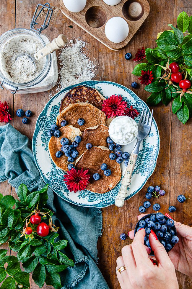 Jag gjorde en stor sats av dessa pannkakor i somras och stekte till lunch ute på vår stekhäll. Det var riktigt enkelt och smidigt. Och lunchen räckte till många.