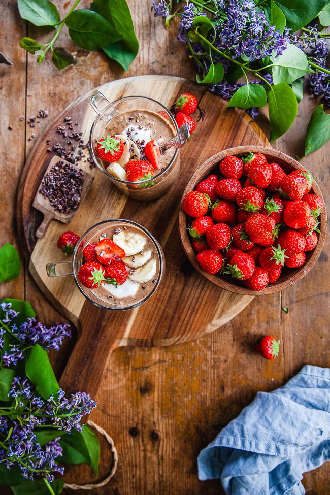 Jag lyxade till det extra mycket här. Både kvarg, banan, jordgubbar och kakaonibs. Det sistnämnda för att det ger en extra god chokladsmak men också lite konsistens.